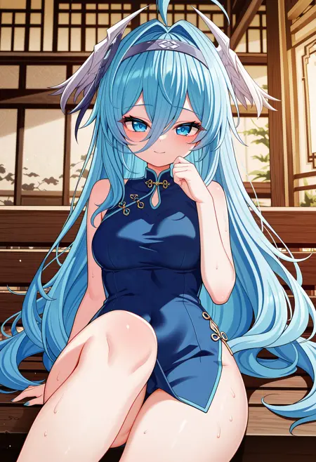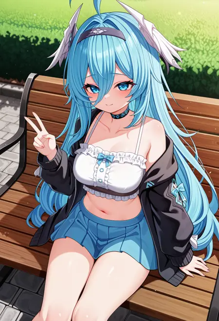 Fina, blue hair, long hair, hairband, hair intakes, hair between eyes, ahoge, blue eyes, head wings,