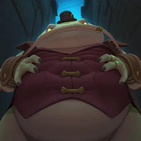 tklolrt, tahm kench, yellow sclera, no pupils, black claws, tail, black top hat, gold hat ornament, two-tone jacket, black jacket, brown jacket, maroon vest, brown arm guards, ornate ring