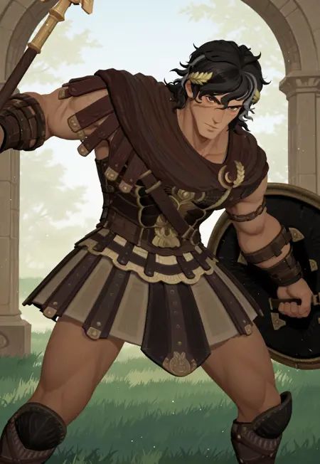 | トレーニングワード | P3RS3USAFK, messy hair, Black hair, medium length hair, two-tone hair, grey hair, muscular male, brown eyes, leather greek armor, brown leather armor, shoulder cape, short cloak, one-shoulder cape, battle skirt, pleated skirt armor, strapped sandals, gold laurel crown, brown skin, leather bracers, knee greavesコピーしました! |
