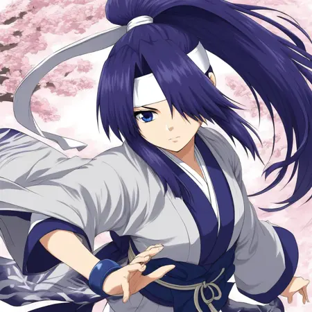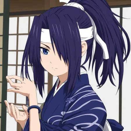 1girl, solo, Kaori Sanada, dark purple hair, long hair, ponytail, high ponytail, hair over one eye, long bangs, sidelocks, white headband, headband, blue eyes, kimono, japanese clothes, haori, white haori, dark blue bracelet,
