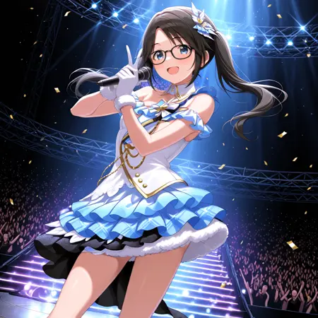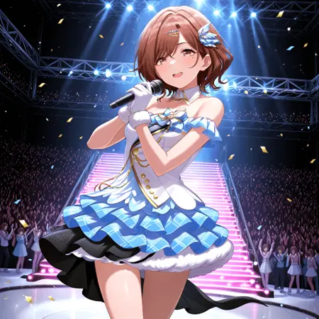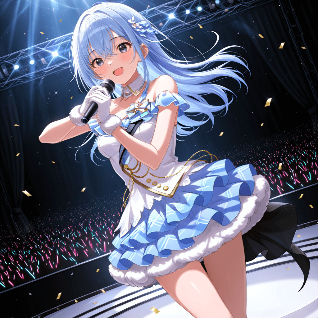 BETB_outfit, hair ornament, white and blue ornament, white and blue dress, black fishtail, single fishtail, strapless dress, white fur trim, layered dress, sleeveless, frills, fur-trimmed skirt, detached collar, white collar, white gloves, fur-trimmed gloves, thighs, white boots, fur-trimmed boots