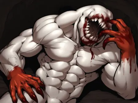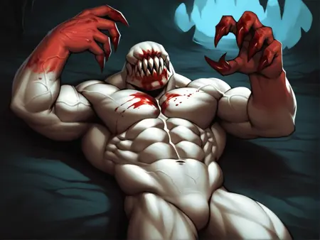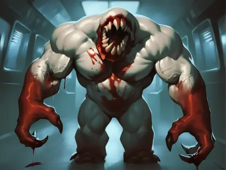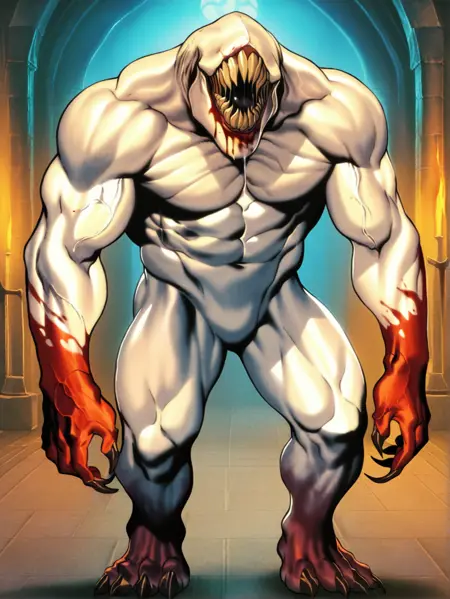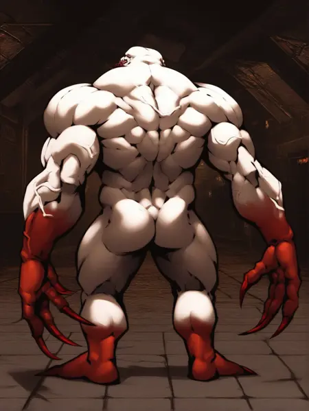 There were also several different visions of this character. Some artist drew it as just white skinned and blood covered creature, some - as white- and red-furred creature. This Lora has both of them. Be advised, if you use furred version with view from behind, it tends to generate shambler with animal ears and more prominent head, just as a regular furry character.
