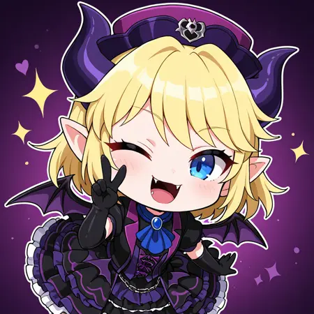 Nina, short hair, blonde hair, blue eyes, wings, bat wings, demon girl, demon horns, short horns, pointy ears