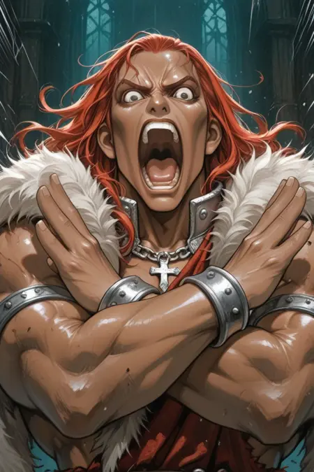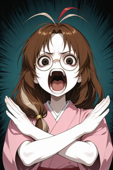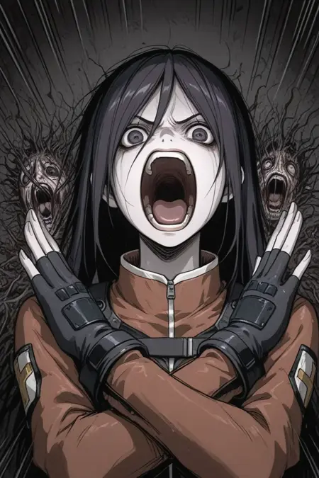 ,,,ng,solo,wided_eyes,open mouth,screaming,crossed arms,cross chop,close up,looking at viewer,upper body,horror\(theme\),focus lines,upper body,,,