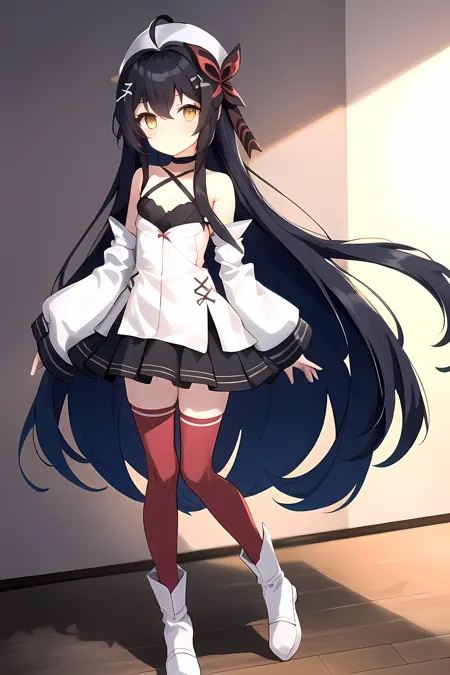 Positive Prompts: <lora:geopelia-v100:0.75>, 1girl, long hair, black hair, bangs, hair ornament, yellow eyes, hair between eyes, hat, ahoge, long sleeves, (white dress:0.85), black pleated skirt, (red thighhighs:1.1), detached sleeves