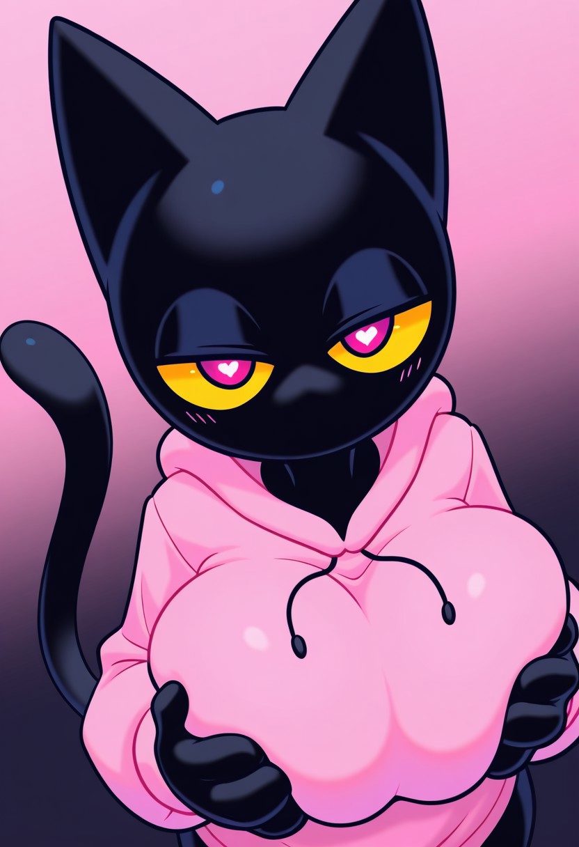タグ: solo, 1girl, big breasts, olive_69, feline, furry, female, black body, yellow sclera, gradient sclera, dark-blue eyes, green pupils, no mouth, mouthless, no nose, noseless, cat ears, cat tail, pink hoodie,