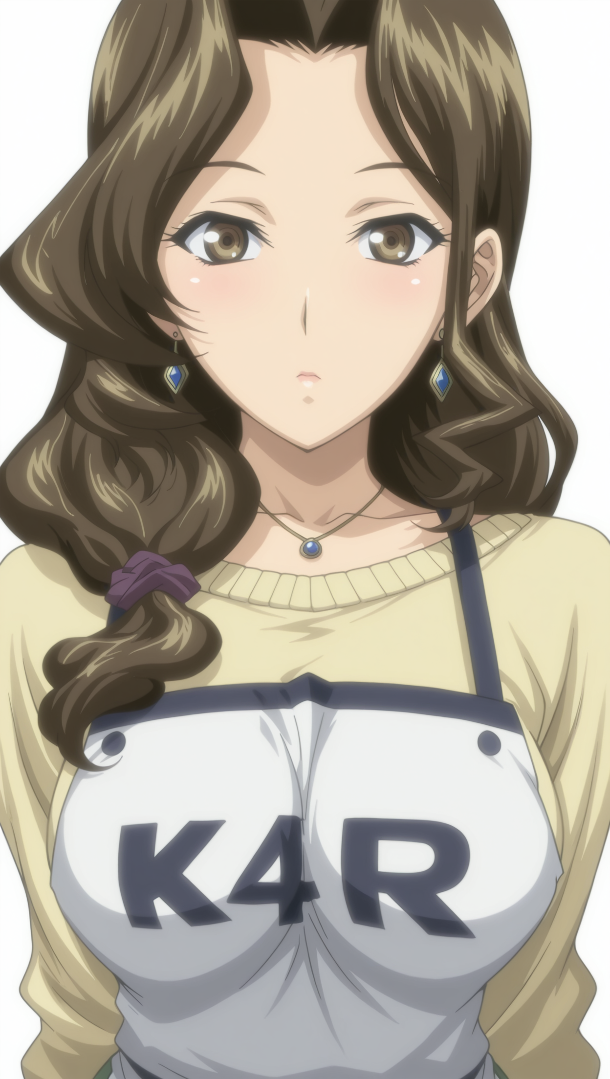 anime coloring, masterpiece, best quality, amazing quality, k40r1, 1girl, low-tied long hair, brown hair, large breasts, sweater, apron, skirt, green skirt, earrings, pendant, necklace, solo, pose, standing, looking at viewer, from front, ((((white background, simple background))))