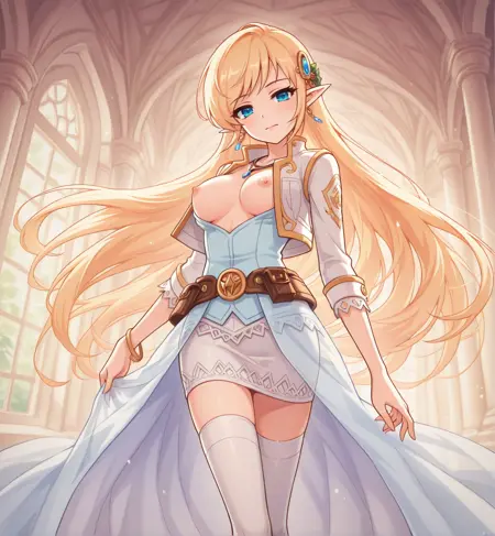 mercedes_\(maplestory\),Mature women,blonde hair, long hair, blue eyes, pointy ears, earrings, jewelry, skirt, belt,hair ornament, thighhighs, very long hair,
