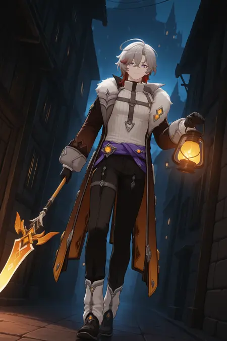 Trigger words: 1boy, illuga_genshin, blue eyes, red pupils, grey hair, ahoge, mole under eye, red colored tips, single red cross earring, scar on neck