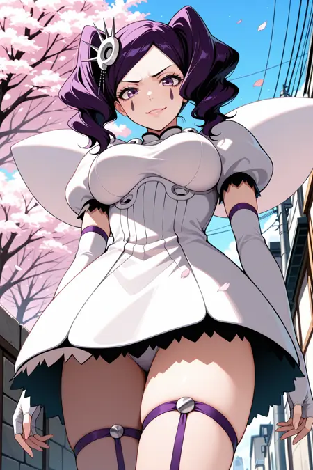 cirucci sanderwicci,短双马尾,紫色头发,发饰,紫色眼睛,扫形刘海,面部纹身,泪滴状面部标记,紫色嘴唇,口红,漂白