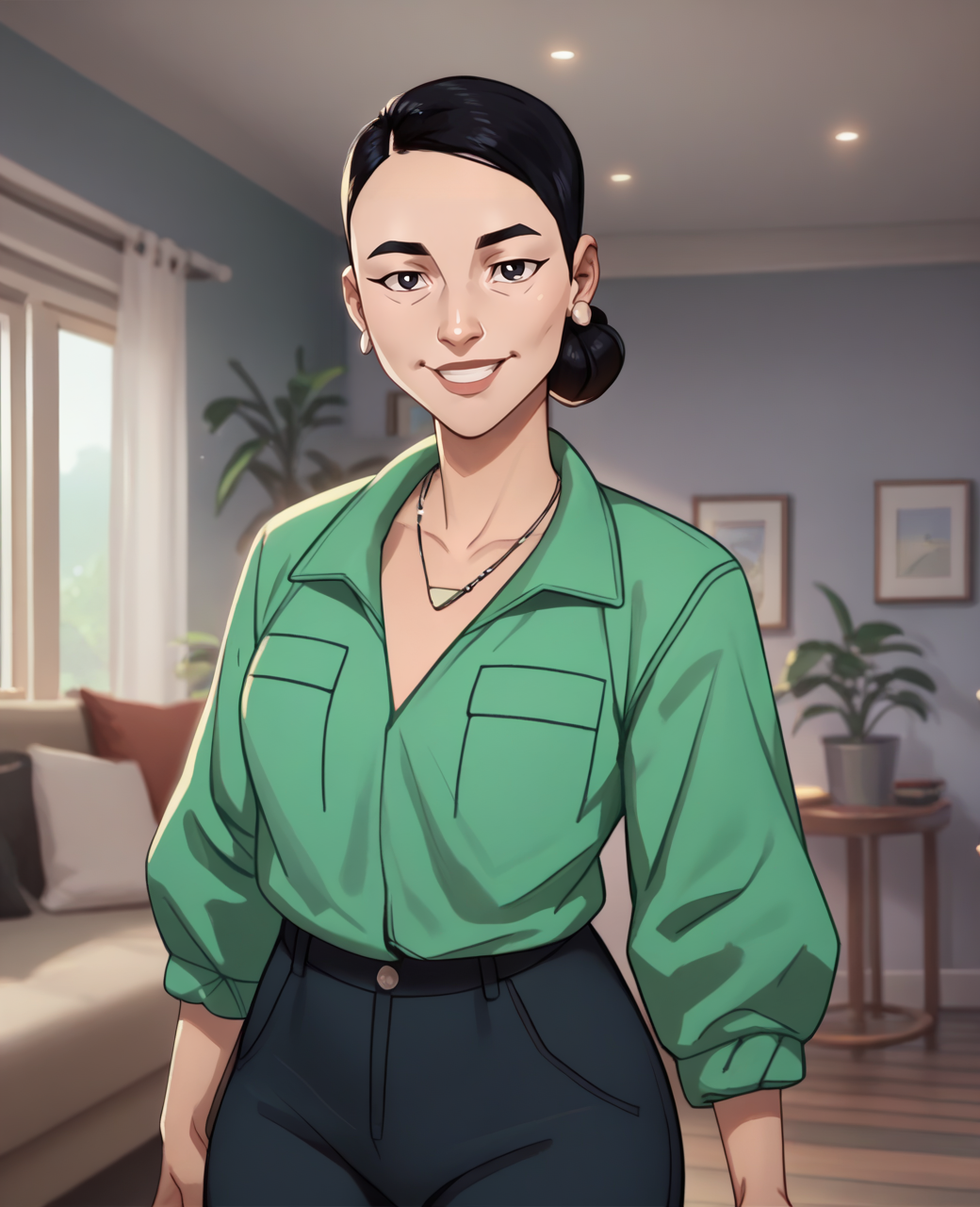 Debbie, brown eyes, or black eyes, hair bun, black hair,