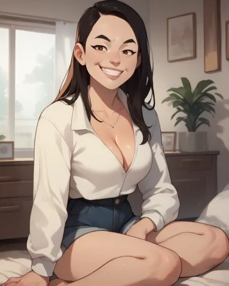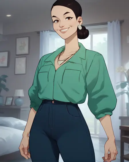 Debbie, brown eyes, or black eyes, hair bun, black hair,