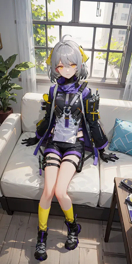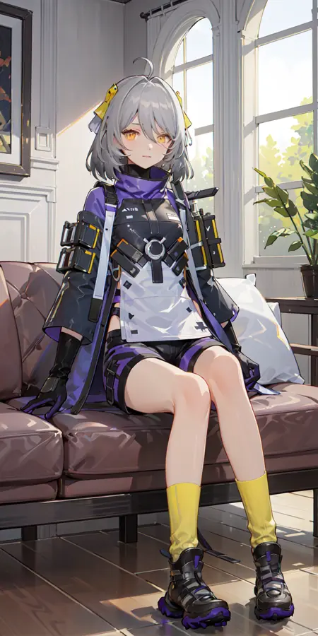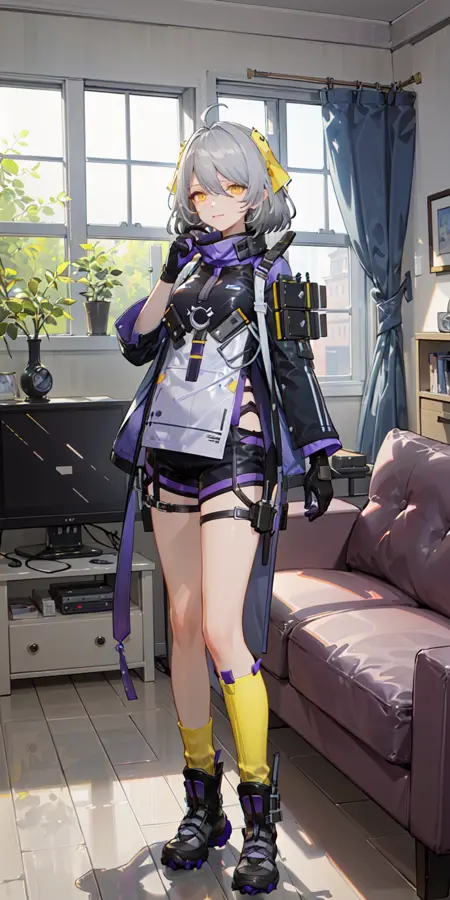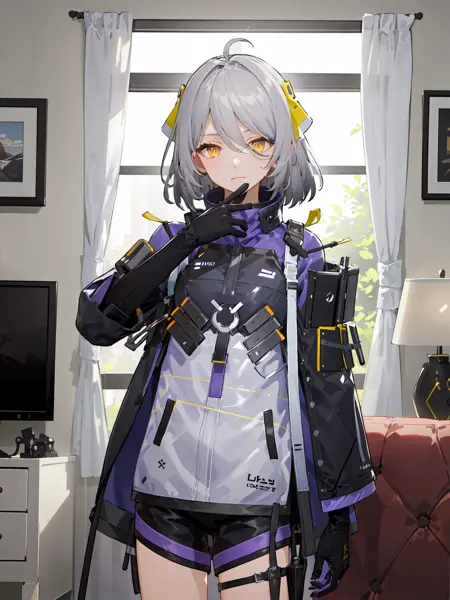 ANKAXIYA, tactical_jacket, shorts, gloves, high_heel_sneakers, short_socks, headdress, grey_hair, short_hair, ahoge, yellow_eyes