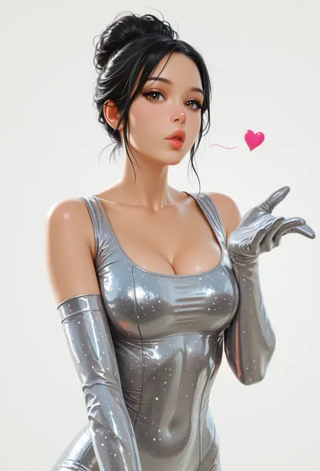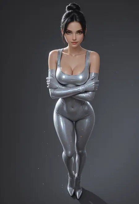 IconKimKF,黑发,单发髻,棕眼,嘴唇,紧身,中等胸部,灰色肘套,乳沟,灰色紧身衣,闪亮衣物,高跟鞋,