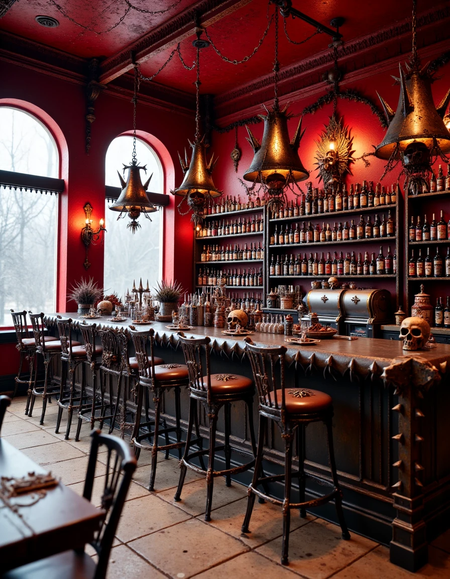 "想象一家被科恩触碰的咖啡馆,墙壁呈血红色,家具为尖锐金属结构,吊灯布满尖刺。柜台用铁材加固,桌面上装饰着头骨图案。空气中弥漫着燃烧咖啡的气味,整个店铺充斥着侵略性与力量,仿佛这里是为战争做准备的场所。"