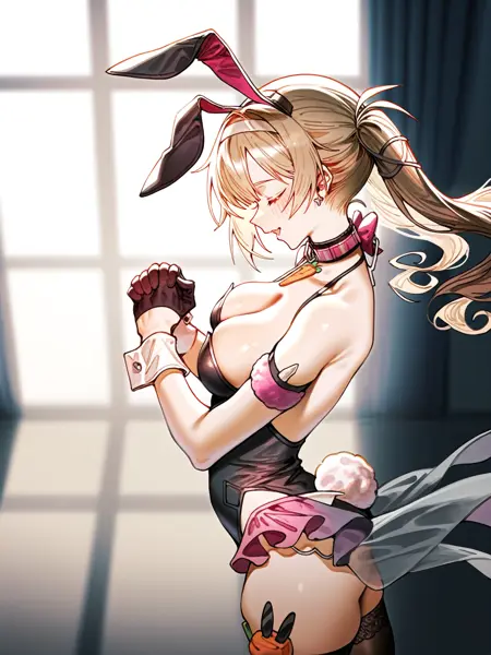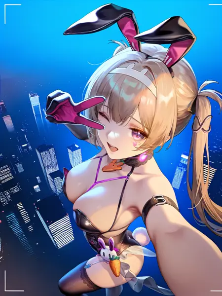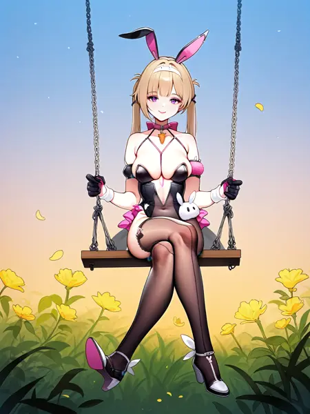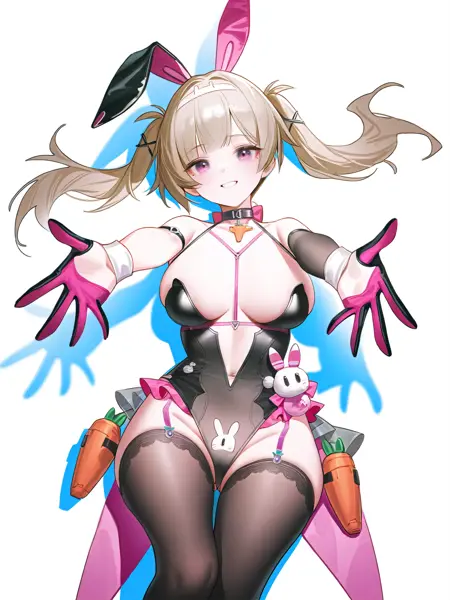 提示词:Marian andreotti,Marian andreotti-riptide_(Bunny Fantasy),light_bloden_hair,purple eyes,white hairband,twintails,fake ils rabbit ears,black thighhighs