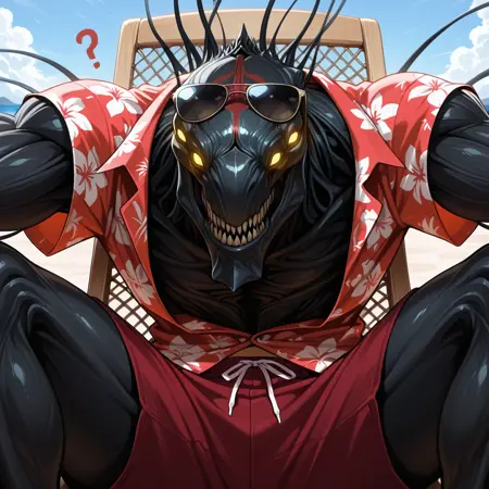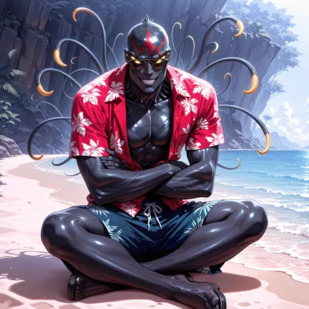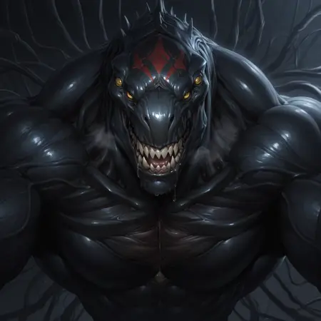 标签(普通):外星人、黑色皮肤、多只眼睛、红色面部纹路、触须、无人类、黄色眼睛、类人形、男性焦点、发光的眼睛