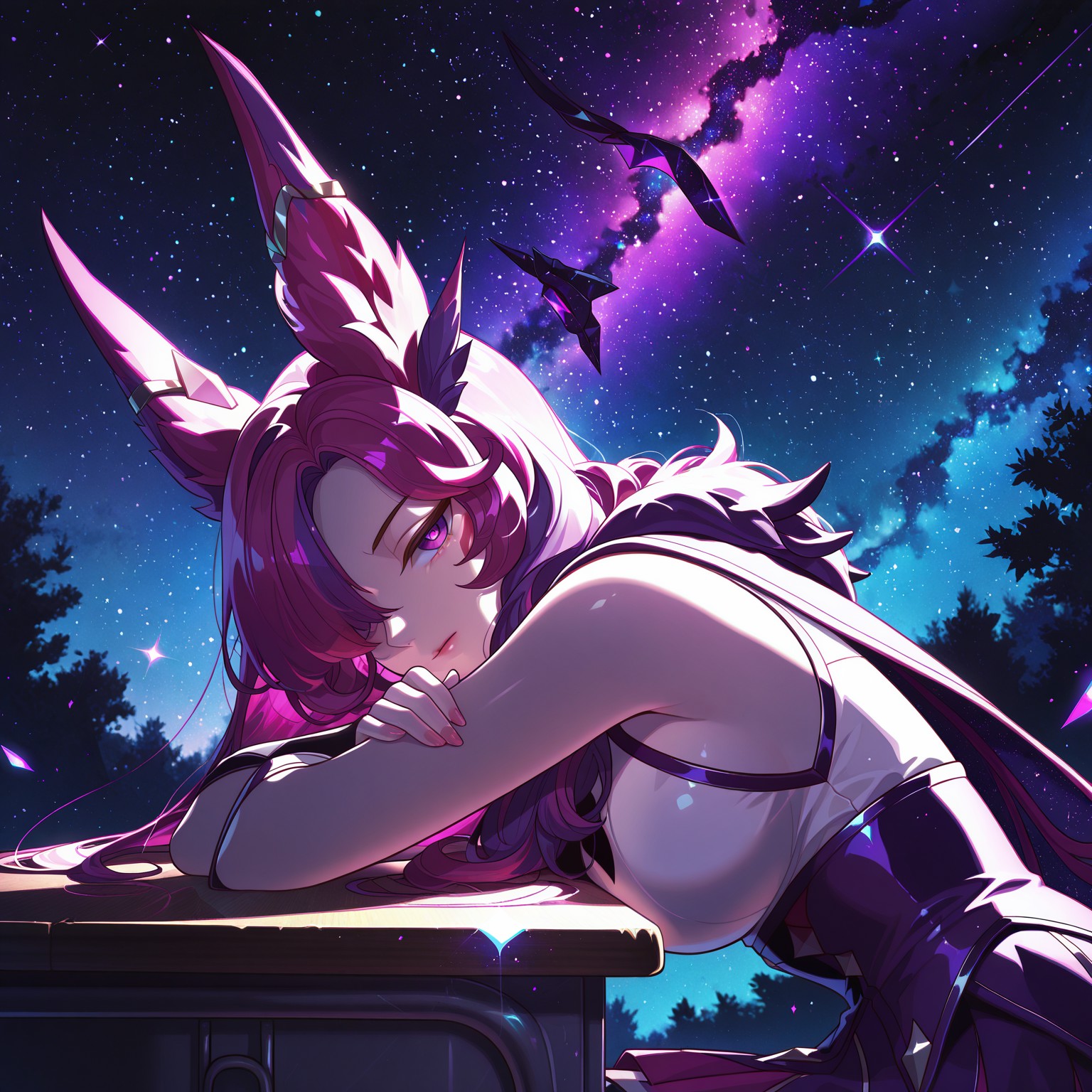 SGxayah,dark magenta hair,long hair,hair over one eye,hair ornament,purple eyes,detached sleeves,bare shoulders,cloak,magical girl,dress,purple cloak,purple skirt,