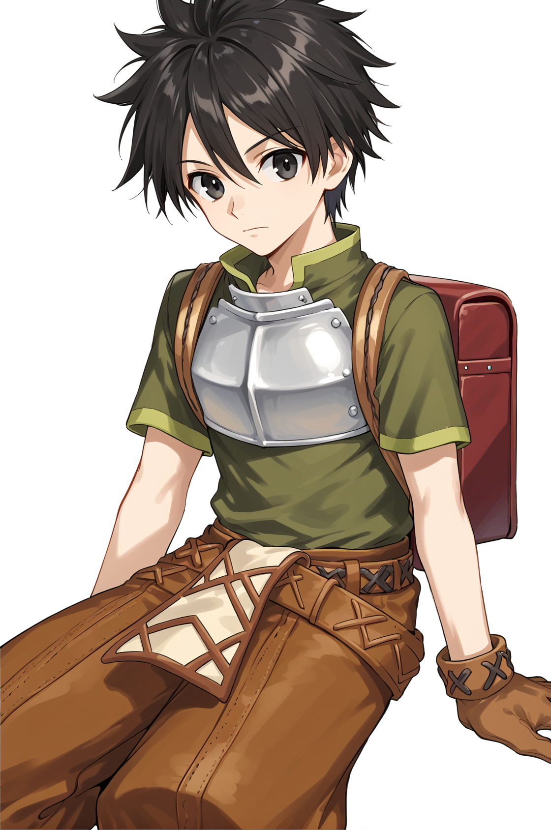 prompt: noviceROMale, backpack, gloves, green shirt, short sleeves, breastplate, belt, brown pants,