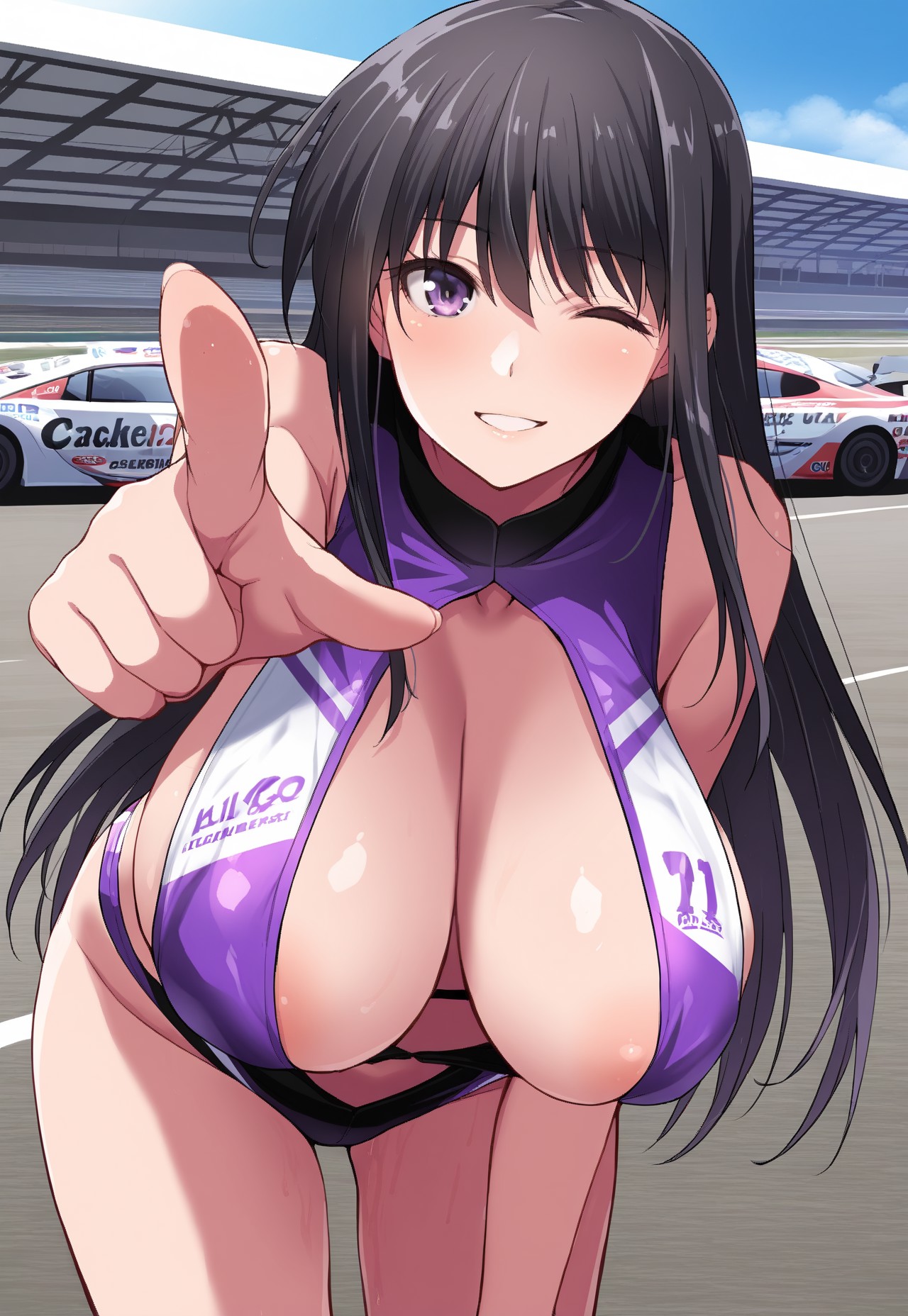 shion_otonari, 1girl, black hair, long hair, purple eyes, huge breasts/large breasts