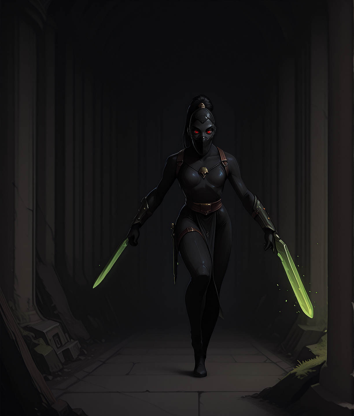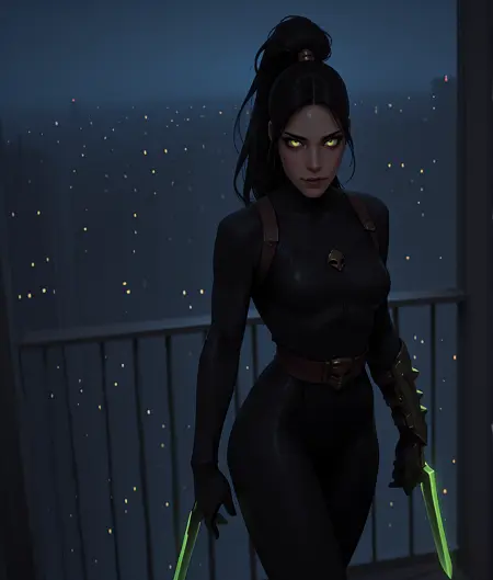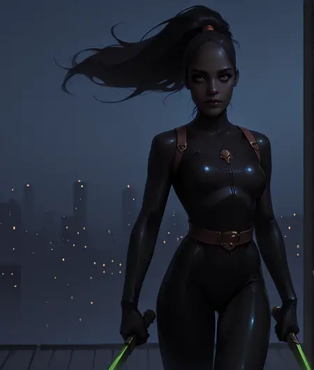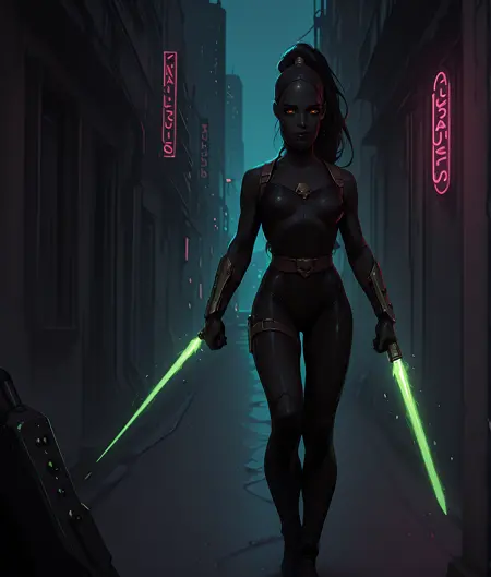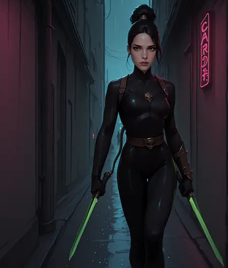 このLoRAは、ダークファンタジーとサイバーパンクの美学に強く影響された、グリムダークな暗殺者キャラクターのイラストを生成するために設計されています。タグには、暗殺者の衣装(ボディスーツ、マスク)、武器(剣、エネルギー剣)、そして印象的な舞台設定(都市、街)が含まれており、視覚的な物語に重点を置いたドラマチックなイラストスタイルを志向しています。