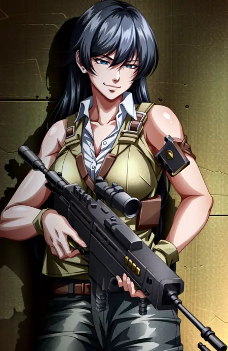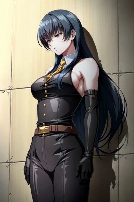 Roberta, 긴 머리, 장갑, 검은 머리, 큰 가슴, 매우 긴 머리, 벨트, 가슴, 옷 정리, 어깨 드러냄, 파란 눈, 낮게 묶인 긴 머리