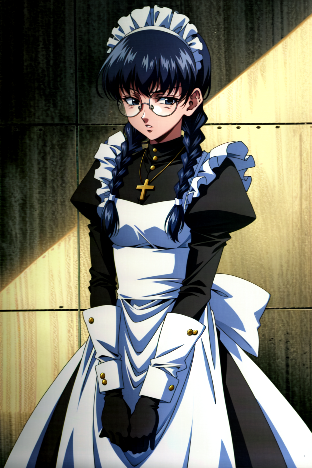 Roberta, 땋은 머리, 쌍 땋은 머리, 안경, 보석, 메이드, 불투명한 안경, 목걸이, 앞치마, 십자가, 메이드 헤드기어, 십자가 목걸이, 긴 머리, 긴 소매, 앞머리, 둥근 안경, 풍성한 소매, 검은 머리