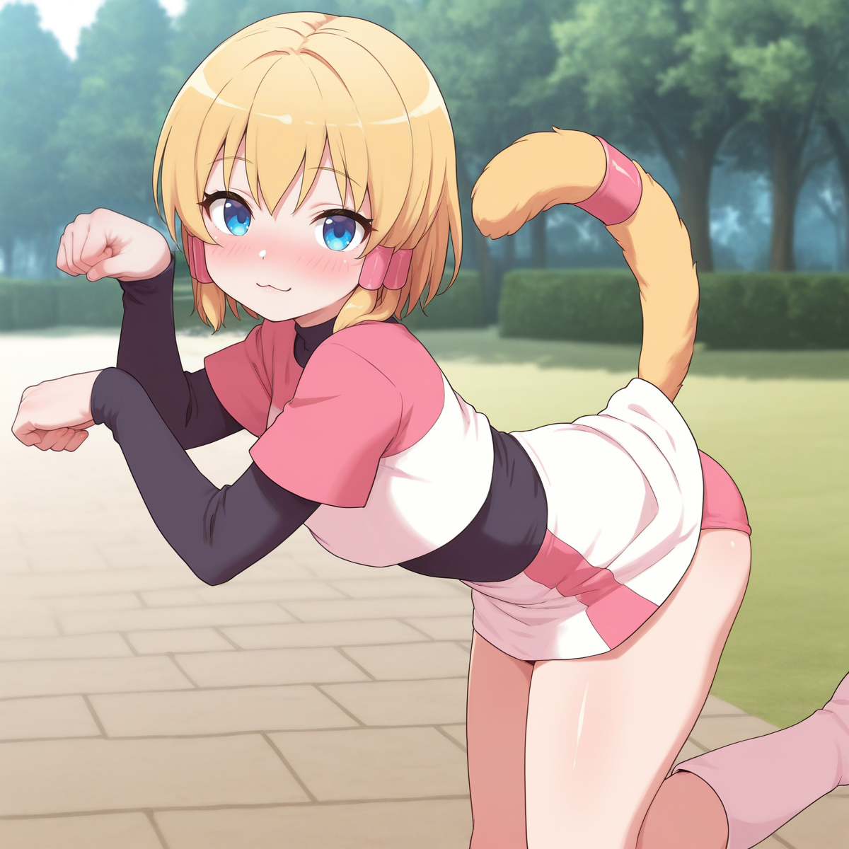 Works on strength 1, but the pink pattern on the skirt isn't consistent. Also her eyes were depicted as blue, green or aqua colored in the dataset, don't know which is the official correct color.