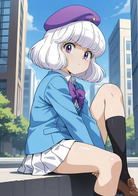 recommend:white hair,purple eyes,school uniform,short hair,medium hair,blazer,blue jacket,collared shirt,white shirt,purple bowtie,miniskirt,pleated skirt,white skirt,black socks,loafers, brown footwear,beret,purple headwear,long sleeves,
