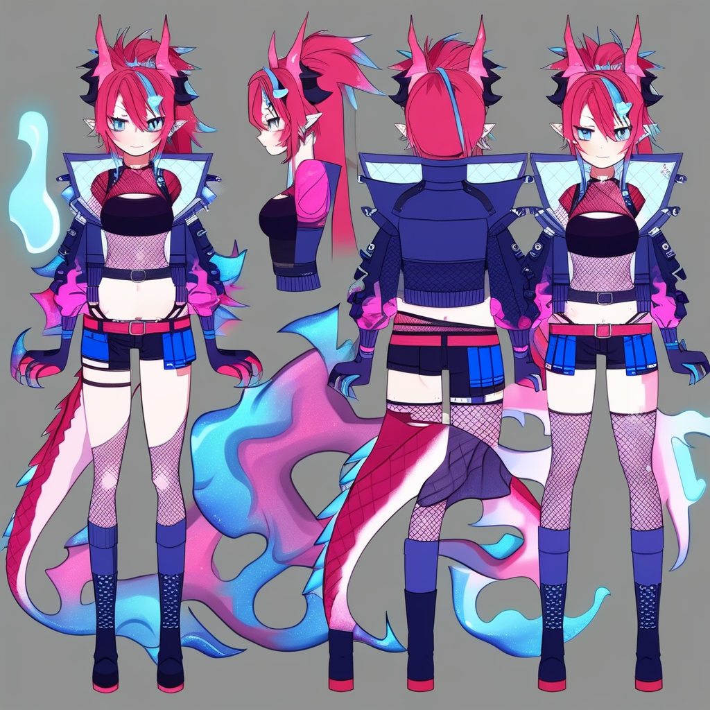 (VTuber_Kai, 긴 머리, 다색 머리, 스트라이프 머리, 파란 머리, 분홍 머리, 꼬리머리, 파란 눈, 뾰족한 귀, 드래곤 뿔, 드래곤 꼬리, 드래곤 소녀, 비늘, 귀 piercing, 초커, 재킷, 긴 소매, 크롭탑, 반바지, 장갑, 발톱, 한쪽 허벅지 스타킹, 피시넷, 부츠),