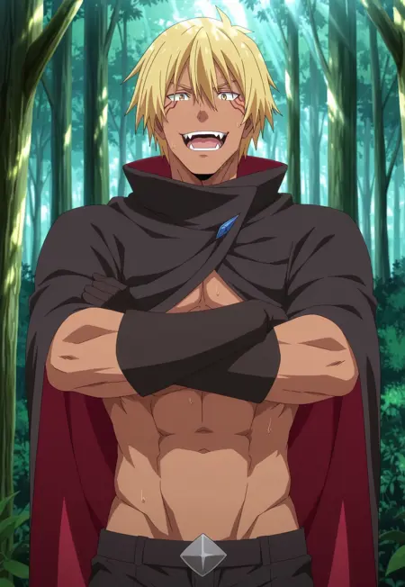 Veldora, blonde hair, hair between eyes, yellow eyes, red markings, dark-skinned male, cape, tattoo, facial mark