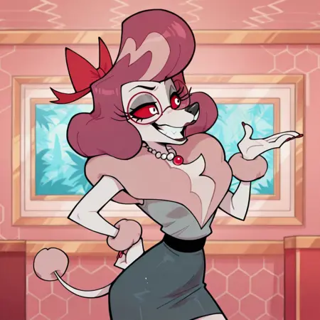 | トレーニングワード | poodle hellhound female, solo, curvy, white fur, pointy black nose, red sclera, white eyes, large dark red glasses, long eyelashes, dark red lipstick, dark pink hair, dark pink bouffant hair, dull pink neck puffy neck fur, dull pink wrist fur puff, thin white tail with dull pink fur puff, white poodle tail with dull pink accents, long red nails, gray sleeveless dress, dark gray straight skirt, pearl necklace, black belt,コピーしました! |