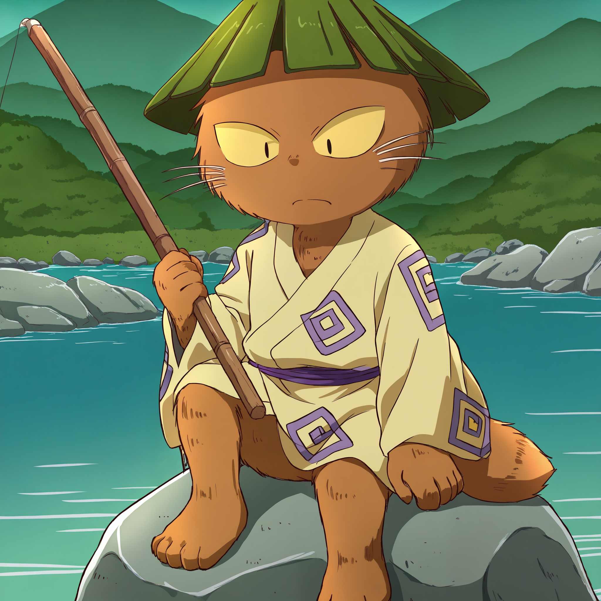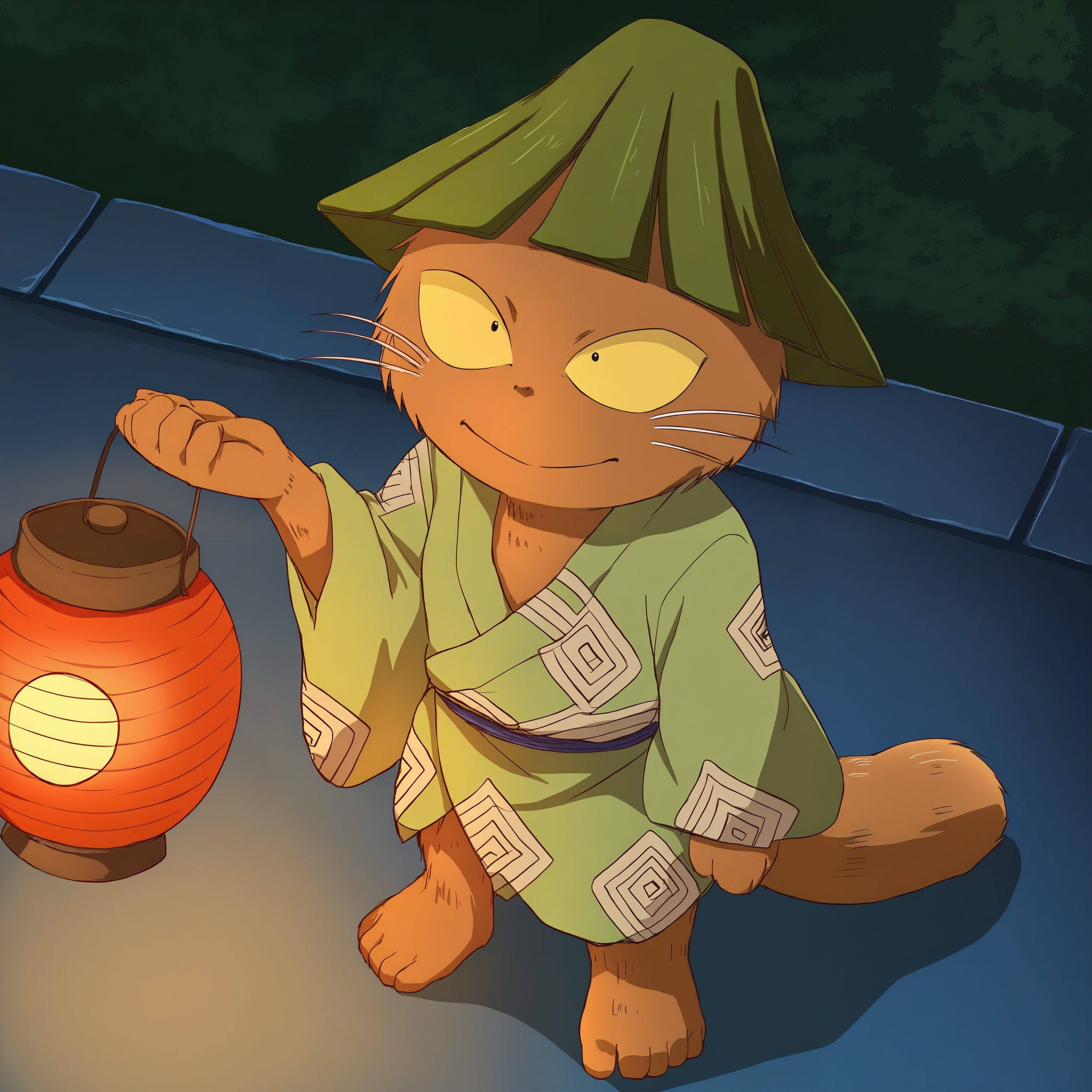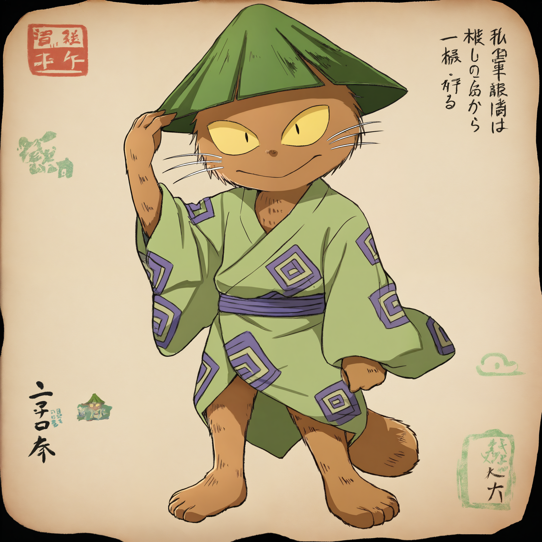 yukai, short, brown fur, black eyes, yellow sclera, green hat, dot nose, barefoot, japanese clothes,추천 네거티브(중요):