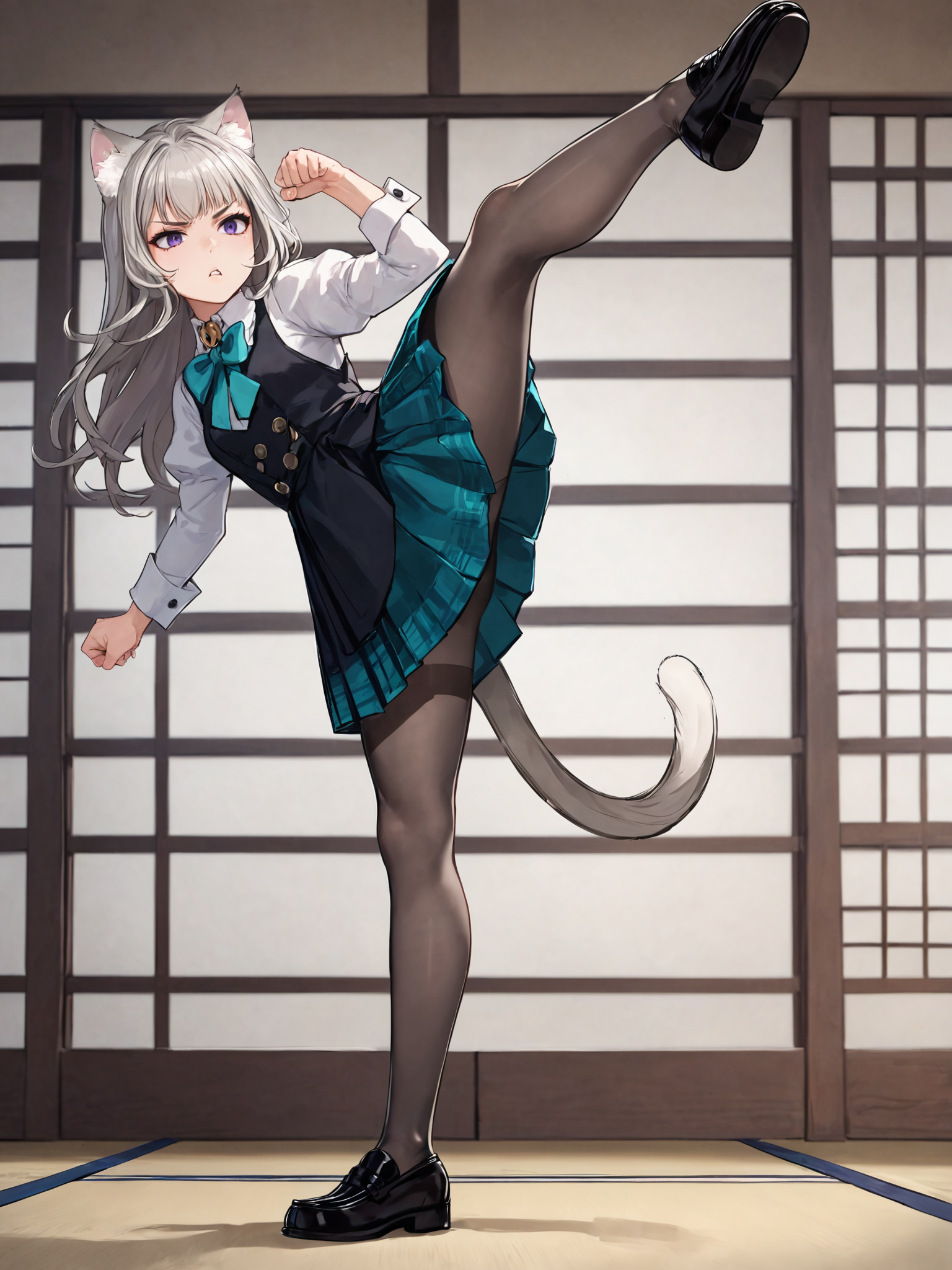 ・長い髪、長袖、黒いドレス、黒いベスト、白いシャツ、タイル色のリボン、タイル色の蝶ネクタイ、腰の後ろのリボン、猫の耳、紫の目、猫の尾、白い髪、グレーのタイツ、黒いローファー、ふわふわ袖、チェック柄スカート、プリーツスカート、黒いスカート、タイル色のスカート