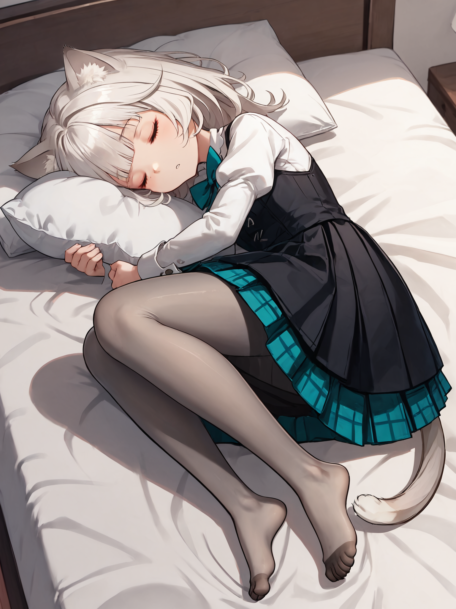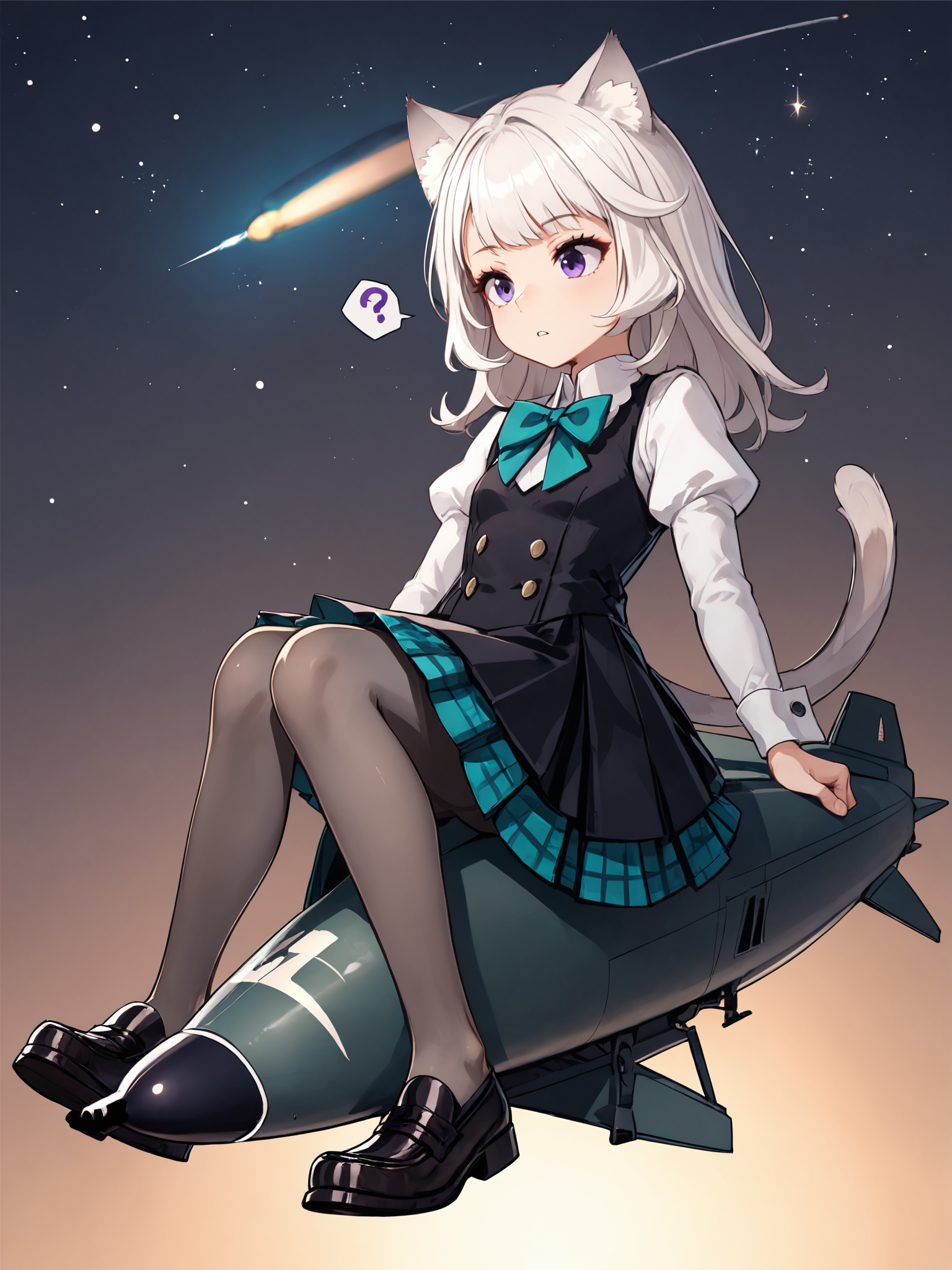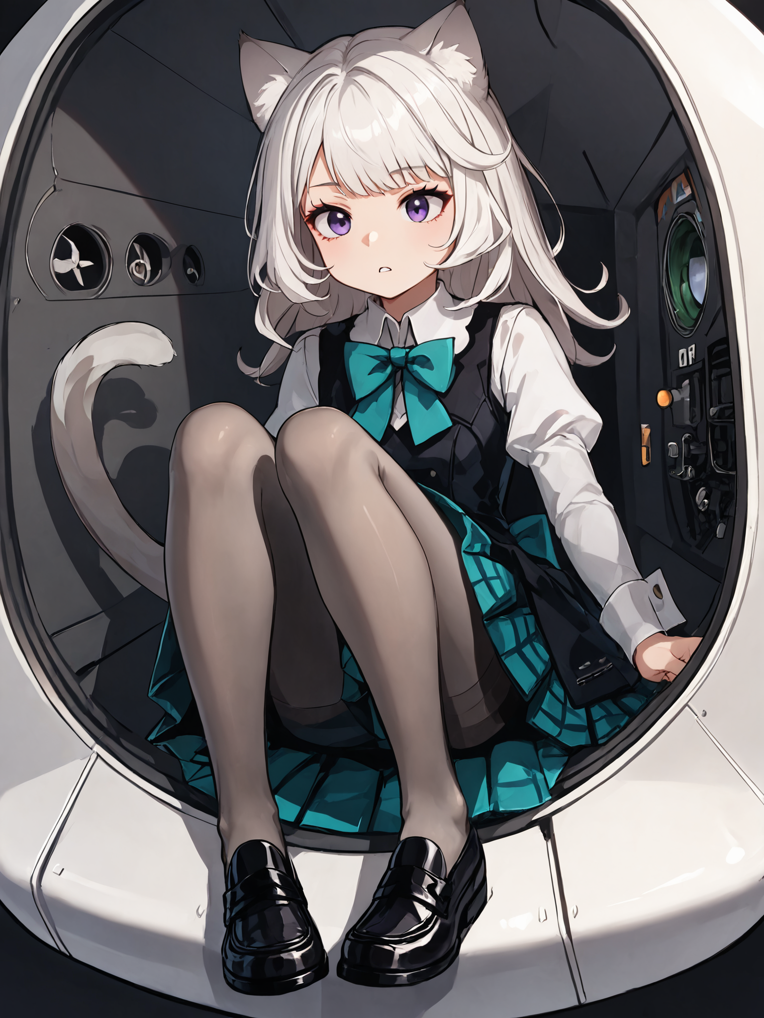 ・Pony/AutismMix Pony: ミディアムロングヘア、長袖、黒いドレス、白いシャツ、タイル色のリボン、タイル色の蝶ネクタイ、腰の後ろのリボン、猫の耳、紫の目、スカートの下にある猫の尾、白い髪、グレーのタイツ、黒いローファー、ふわふわ袖、チェック柄スカート、プリーツスカート、黒いスカート、タイル色のスカート、ボタン