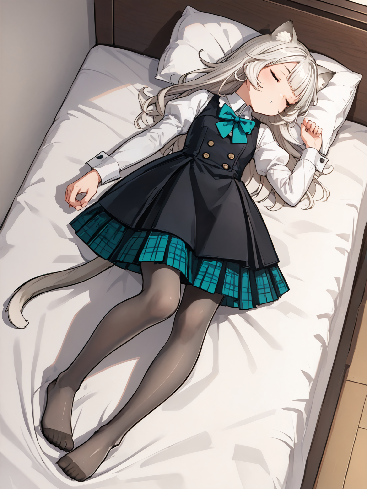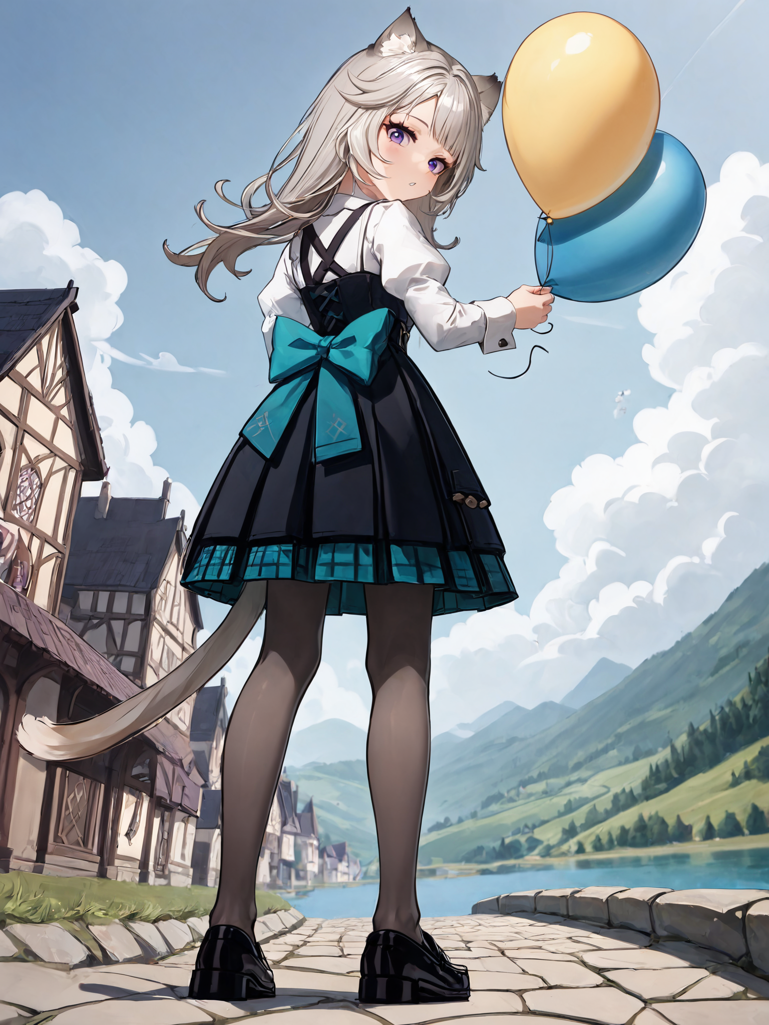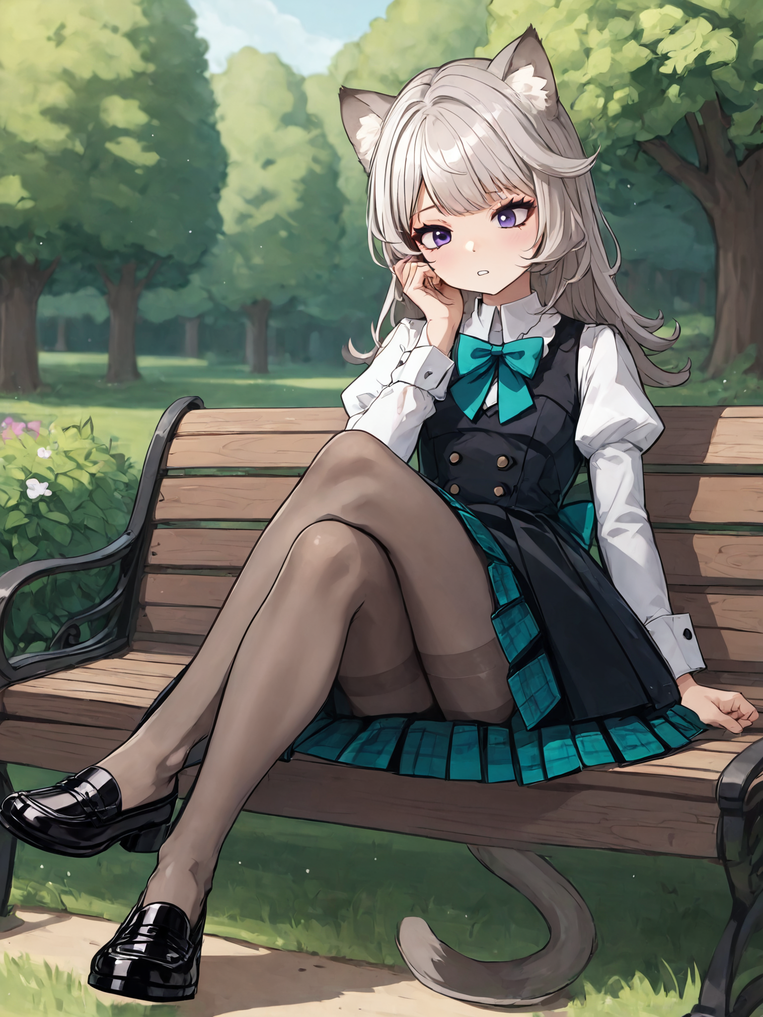 ・长发,长袖,黑色连衣裙,黑色背心,白色领衬衫, teal领结,teal蝴蝶结,腰后蝴蝶结,猫耳,紫色眼睛,猫尾,白发,灰色连裤袜,黑色乐福鞋,蓬松袖子,格子裙,百褶裙,黑色裙子,teal裙子
