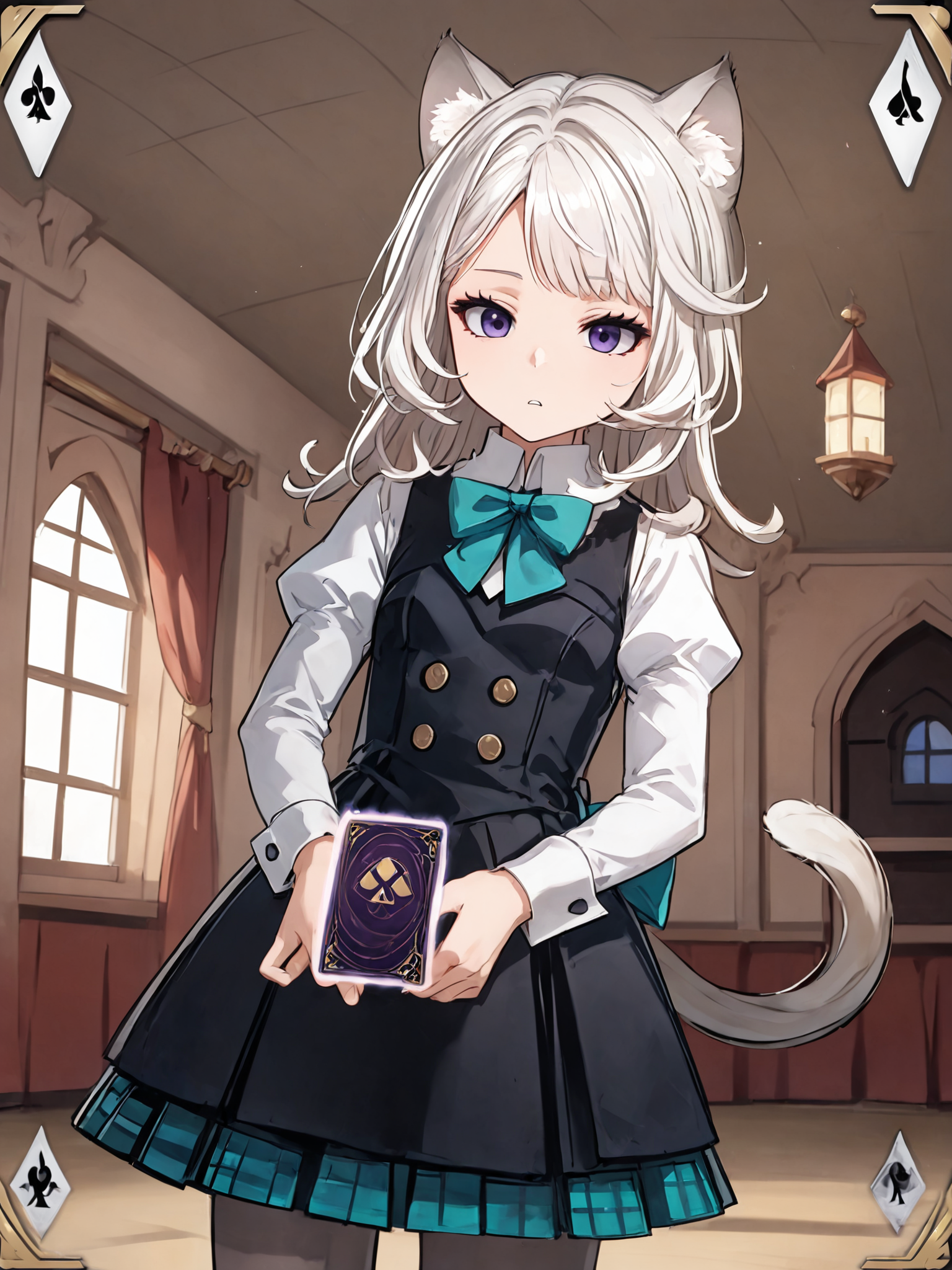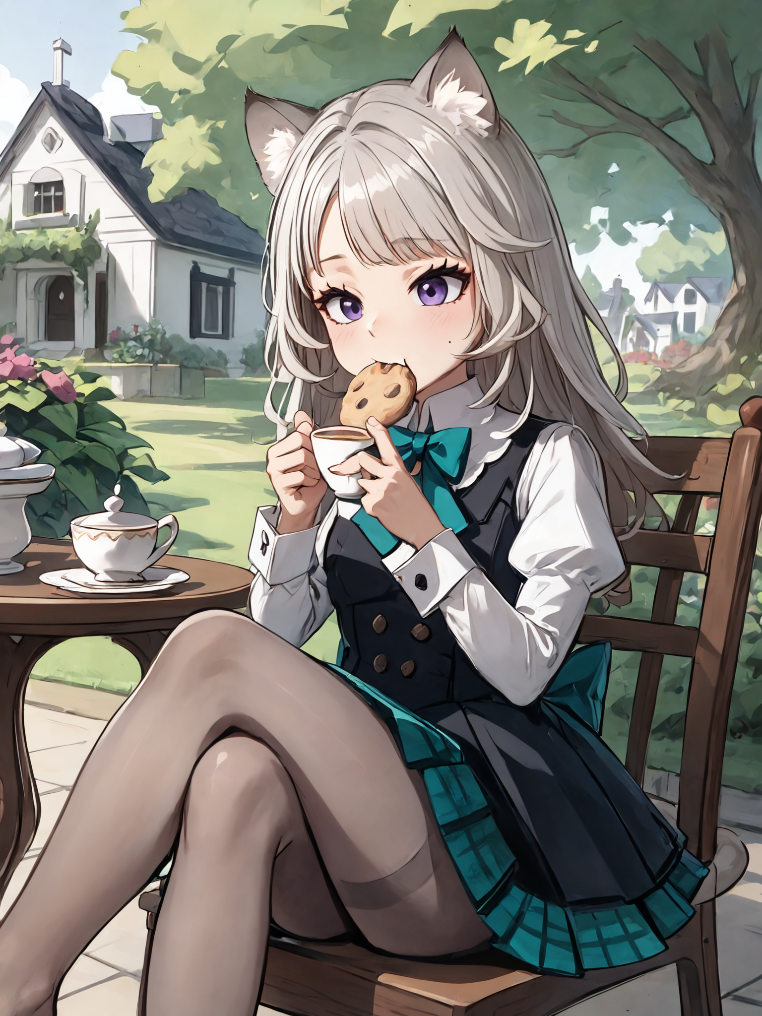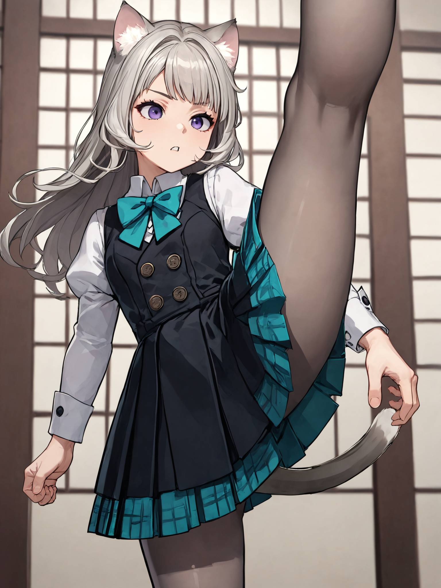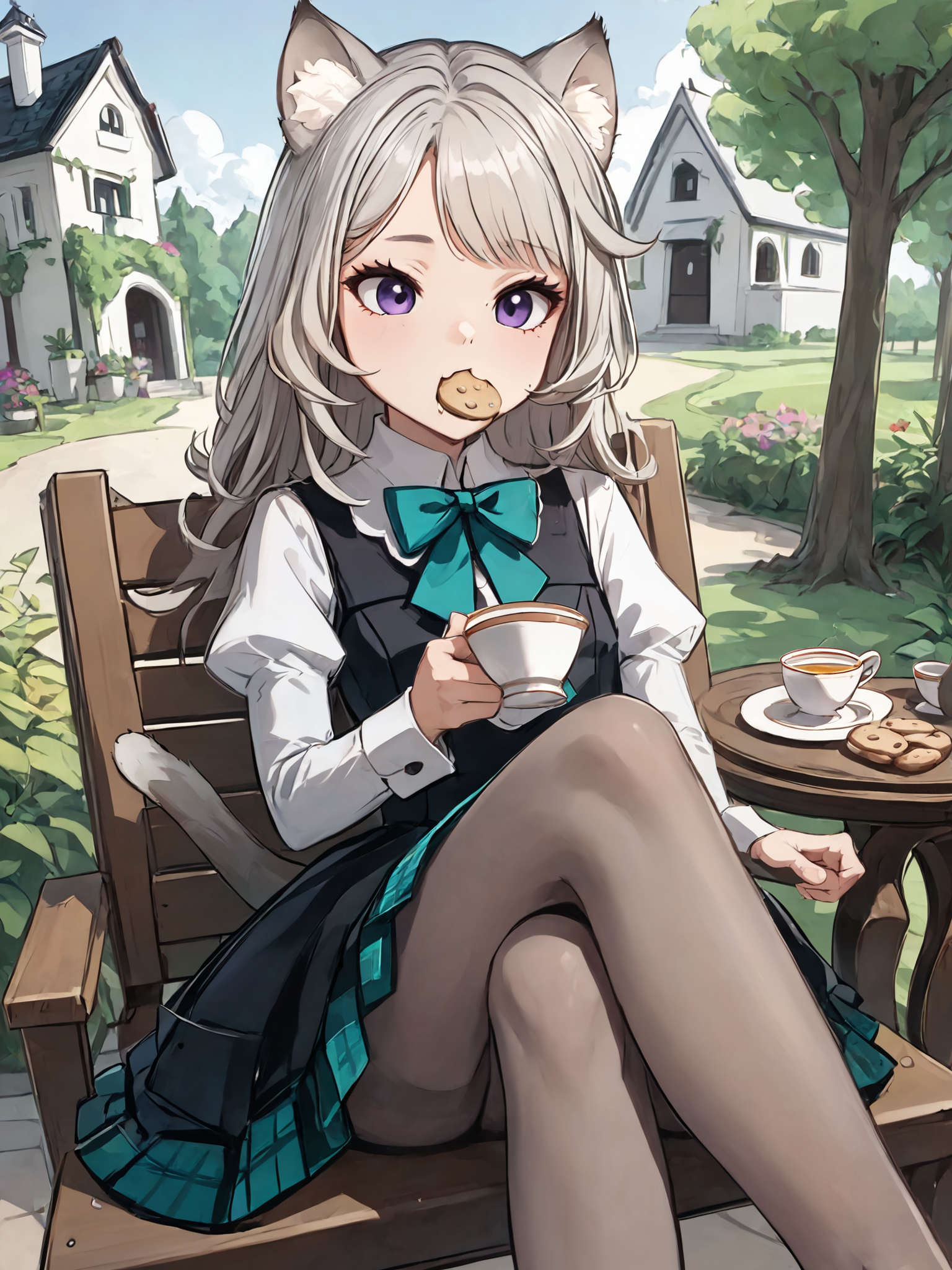・长发,长袖,黑色连衣裙,黑色背心,白色领衬衫, teal领结,teal蝴蝶结,腰后蝴蝶结,猫耳,紫色眼睛,猫尾,白发,灰色连裤袜,黑色乐福鞋,蓬松袖子,格子裙,百褶裙,黑色裙子,teal裙子