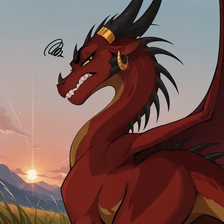 marguerite_ga, dragon, red skin, yellow underbelly, gold horn ornaments, earrings, sharp long spikes, sharp teeth, sharp claws, #yellow sclera, black eyes, 2 wings, tail.