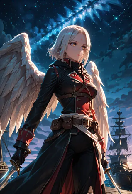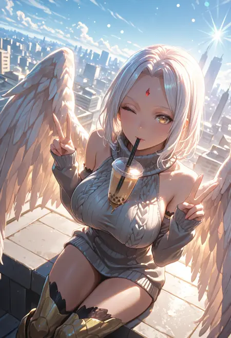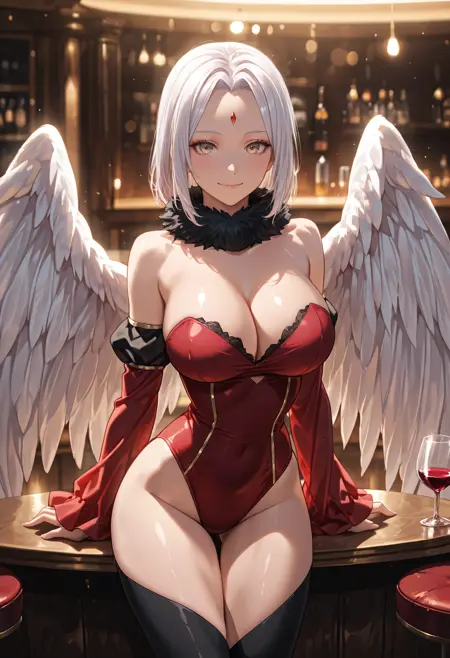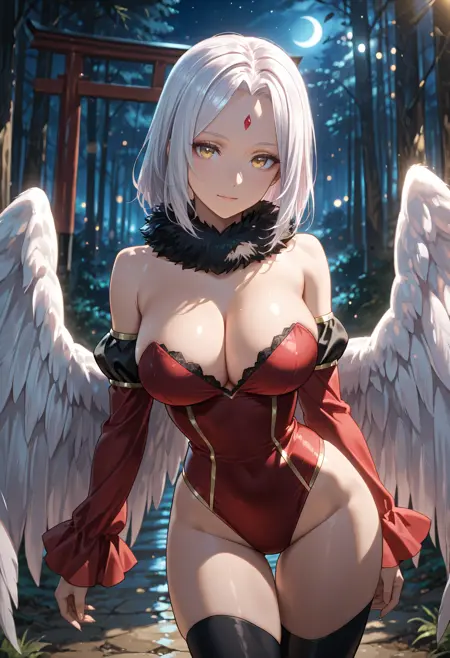 freyxl,黄眼睛,白发,短发,额头宝石,红宝石,魔物娘,鹰身女妖,白色翅膀,羽毛翅膀,白色羽毛,鸟腿,爪子,