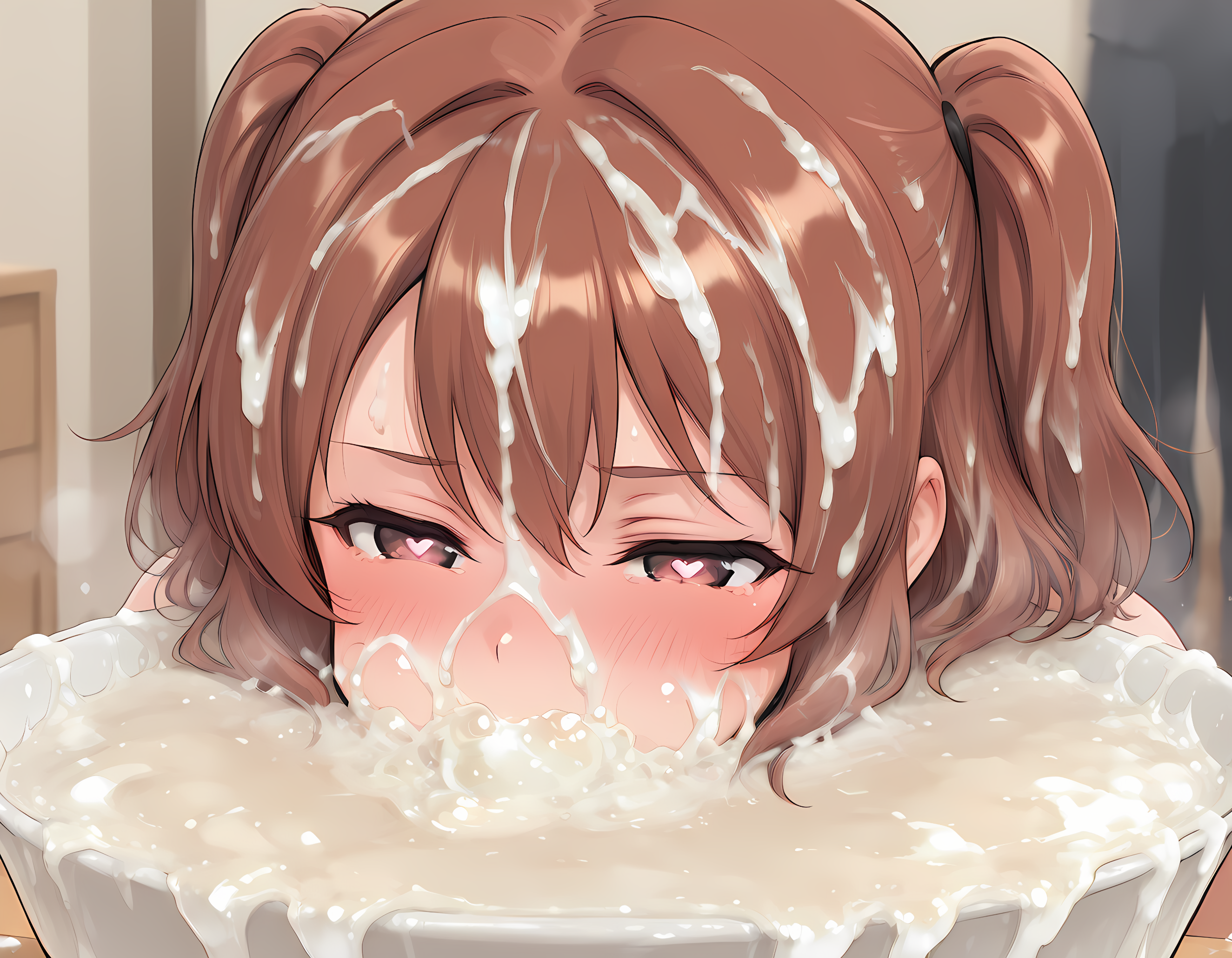 face in cum bowl, cum in bowl, cum on face, cum on hair, cum bubble, excessive cum, face focus