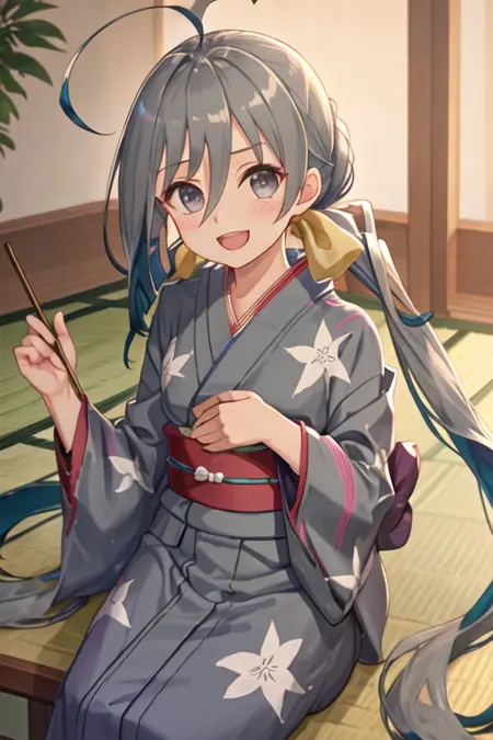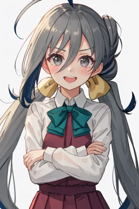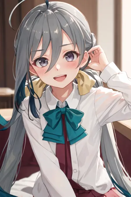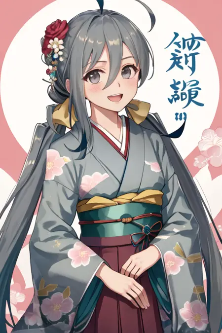 触发词为 kiyoshimo_kantaicollection,推荐标签为:best quality, masterpiece, highres, solo, {kiyoshimo_kantaicollection:1.15}, long_hair, grey_hair, ahoge, twintails, hair_between_eyes, grey_eyes, low_twintails, smile, bow, very_long_hair, bowtie, blush, open_mouth。