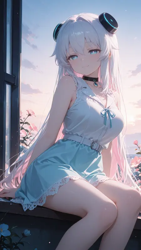 Alma-chan, blue eyes, white pupils, white hair, pink inner hair, long hair, hair bangs, long sidelocks, hair ornament, (black choker), medium breasts, android,