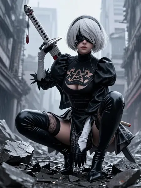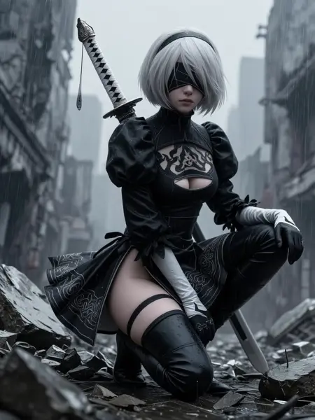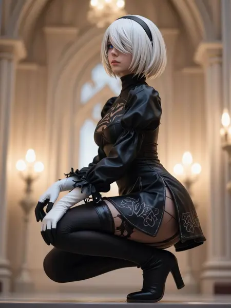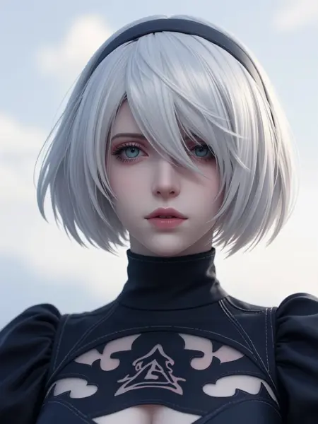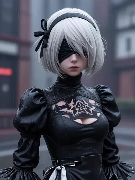 トリガー単語を含む例のプロンプト:2B\_NierA, a young woman with short white bob-cut hair and straight bangs, eyes obscured by a black visor, wearing a black high-collared gothic dress with puffed sleeves, chest cutout, fitted bodice, black gloves, and thigh-high stockings, medium shot, standing upright with a calm, stoic expression against a muted, textured background.