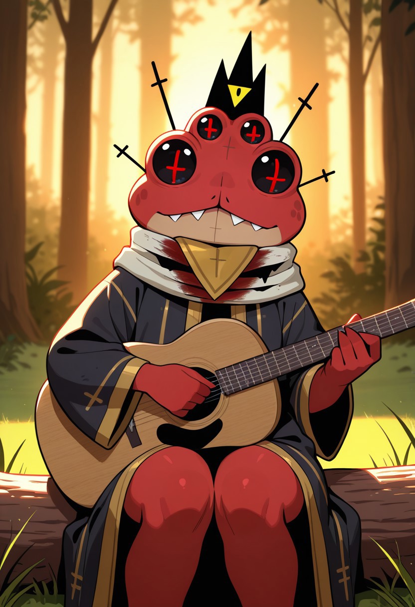 以下是提示词:Heket,女性,独身,青蛙,两栖动物,四只眼睛,红色瞳孔,黑色巩膜,十字形瞳孔,红色皮肤,奶油色腹部,尖锐牙齿,额头有十字架,长袍,白色围巾,染血围巾,王冠,