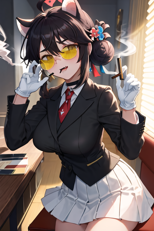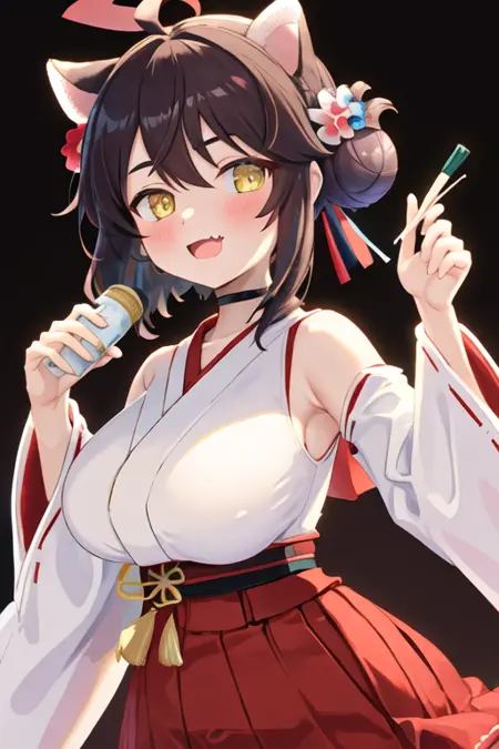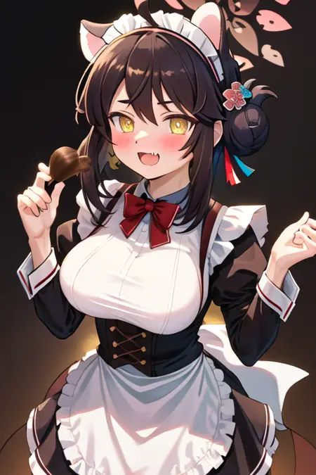 トリガー語はkaede_bluearchive、推奨タグはbest quality, masterpiece, highres, solo, {kaede_bluearchive:1.15}, animal_ears, breasts, blush, halo, ahoge, hair_bun, yellow_eyes, large_breasts, hair_between_eyes, open_mouth, fang, hair_ornament, single_side_bun, skin_fang, black_hair, oppai_loli, upper_body, brown_hair, hair_flowerです。