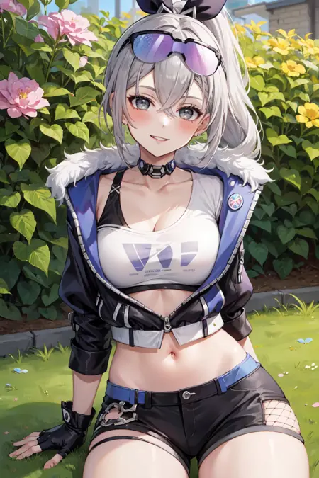 silver_wolf, long hair, eyewear on head, jacket, ponytail, gloves, black jacket, sunglasses, black gloves, shorts, fingerless gloves, hair between eyes, shirt, drill hair, black shorts, navel, white shirt, choker, crop top, fur trim, midriff
