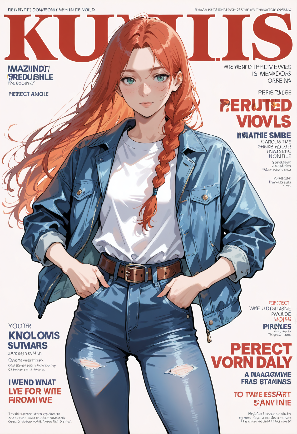 주근깨, 땋은 머리, 바지, 벨트, 셔츠, 재킷, 청바지, 신발, 흰색 셔츠, 청바지, 파란색 바지, 흰색 신발, 파란색 재킷, 긴 소매, 열린 옷, 열린 재킷, 단일 땋은 머리, 셔츠 단추 단추, 갈색 벨트