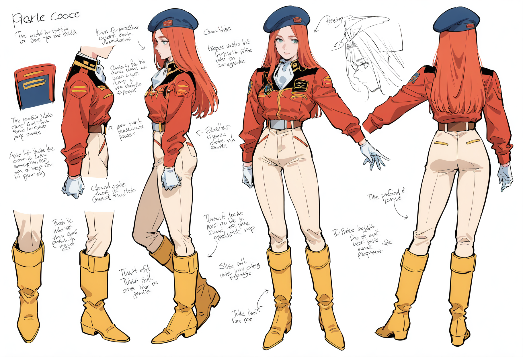 모자, 장갑, 베레모, 부츠, 바지, 재킷, 흰색 장갑, 유니폼, 노랑 신발, 애스코트, 군사, 빨간 재킷, 군사 유니폼, 무릎 부츠, 파란색 머리 장식, 흰색 애스코트, 노랑 바지, 긴 소매, 가슴, 중간 크기 가슴, 벨트