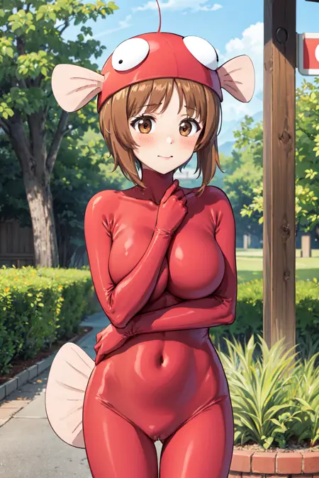 ccmiho,1girl,brown eyes,brown hair,orange hair,short hair,anglerfish,pink headwear,pink bodysuit,(bodysuit:1.4),animal costume