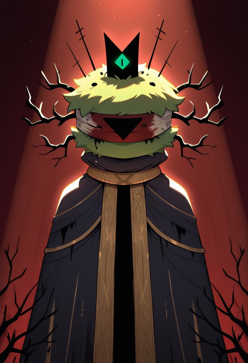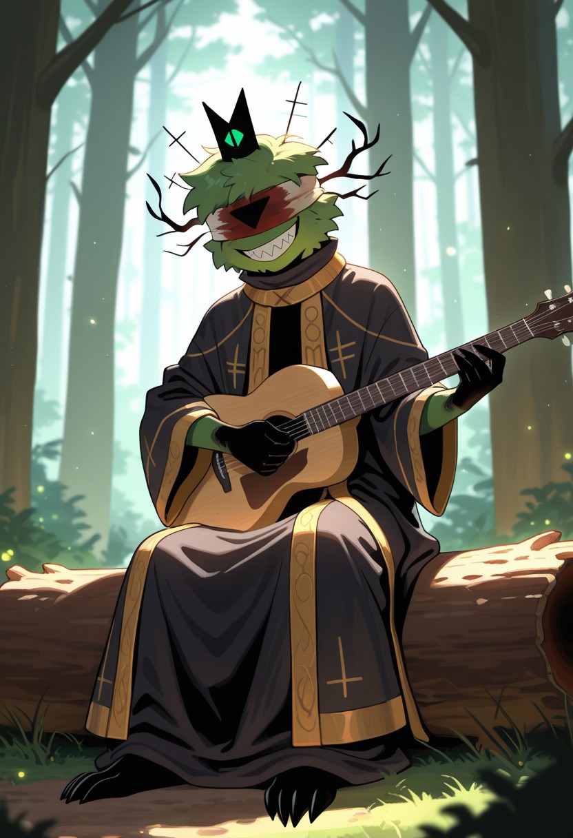 여기에 프롬프트를 남깁니다: Leshy, male, solo, worm, round head covered with thick green leaves, green skin, sharp teeth, black claws, robe, blindfold, bloody blindfold, black triangle in the blindfold, black branches on the head, crown,